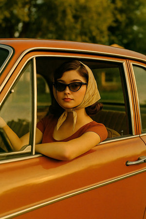 Beautiful girl in a retro car. Photo in old color image style.