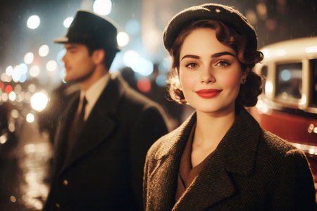 Woman smiling with man in background, both dressed in classic retro attire in the rain