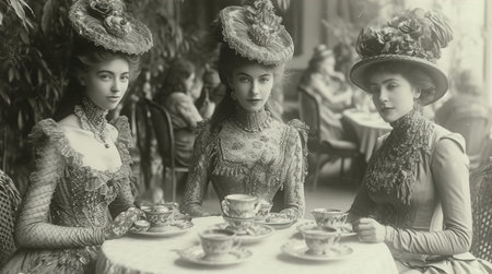 Group photo of women in hats in cafe, vintage photo 1880, 19th century fashion and life style