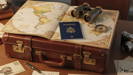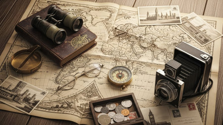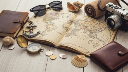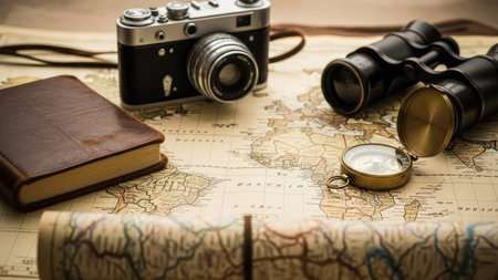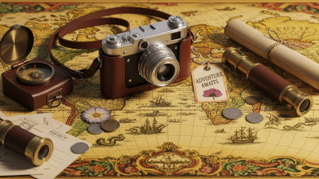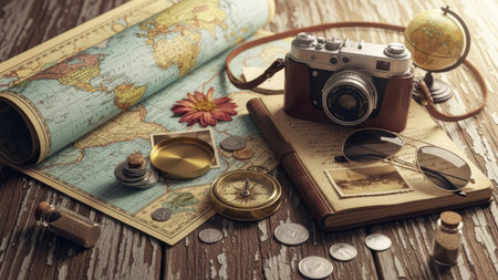 A vintage-inspired setup featuring a retro camera placed on a map, surrounded by travel-themed accessories for an adventurous vibe.