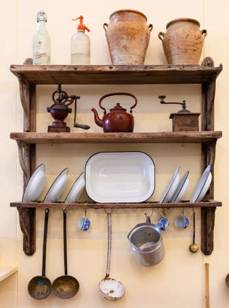 Vejer de la Frontera, Cádiz, Spain - June 14, 2021: Old kitchen utensils on wooden shelves and attached to the wall of a typical Andalusian house in Vejer de la Frontera, Cádiz, Andalusia, Spain