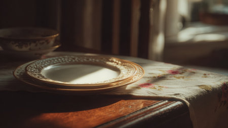 Vintage plate with gold accents is placed on a floral tablecloth, bathed in soft light, enhancing the cozy and inviting ambiance of the dining setting