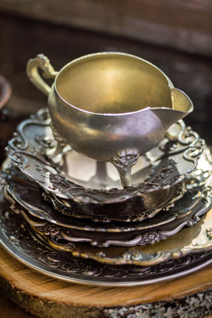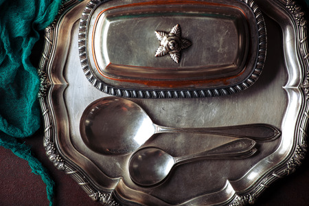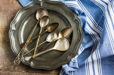 Antique silverware on a wooden table. Dark background. Vintage style.