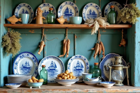Rustic kitchen shelf with decorative blue plates and maritime theme.