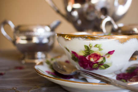 Antique teacup decorated with red flowers on matching saucer with silver spoon in front of antique sterling silver tea set
