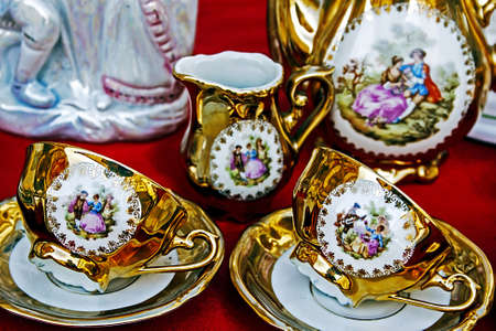 Many porcelain tea cups and pitcher on flea market in Paris, France