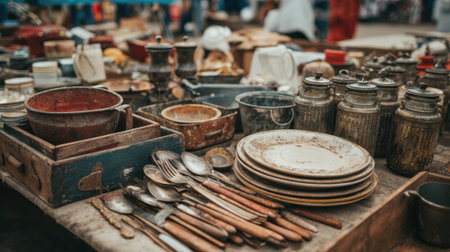 Stalls overflow with an array of antique dishes utensils and charming kitchen collectibles inviting discovery.