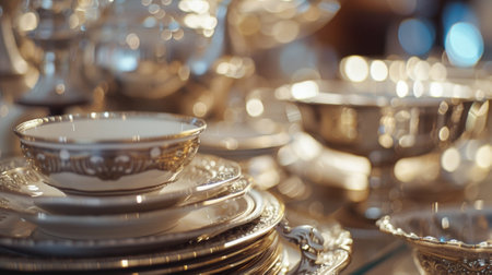 A table set with elegant gold and silver plates and silverware arranged meticulously, Elegant dishes and silverware arranged meticulously