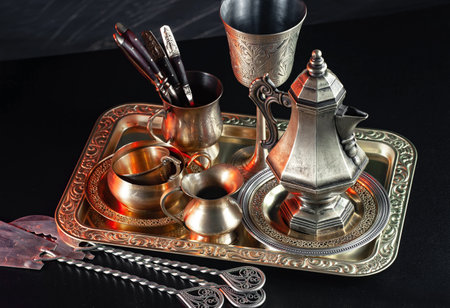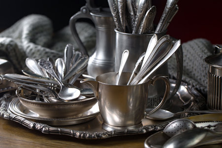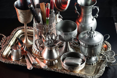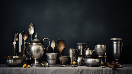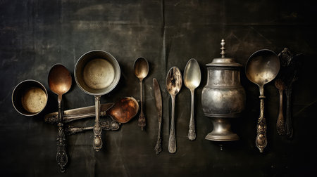 backdrop dark gray background illustration antique silverware, metallic elegant, composition contrast backdrop dark gray background