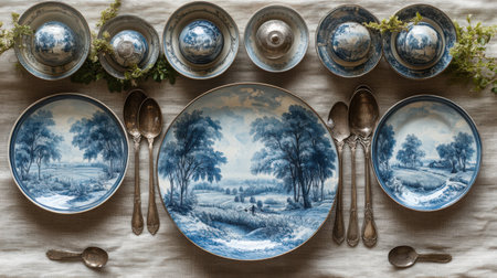 19th century transferware set featuring pastoral scenes in rich cobalt blue, arranged with antique silver spoons on a linen cloth