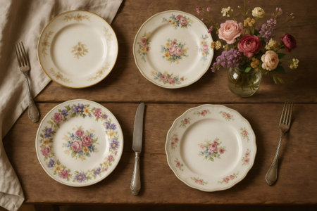 Four vintage floral plates and silverware are arranged on a wooden table with a bouquet of flowers, creating a nostalgic table setting