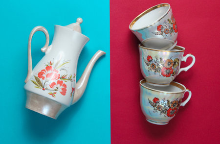 Retro ceramic teapot, stack of cups on blue red background. Top view
