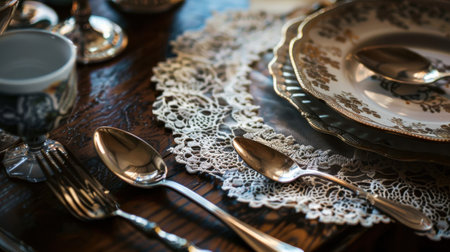 Two silver spoons and a fork rest on a wooden table with a lace doily. A set of elegant china plates with gold trim sits in the background.