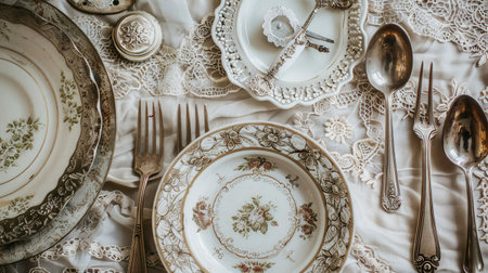 An overhead view displays a formal table setting. The composition features ornate plates, forks, knives, and spoons arranged on a textured surface. The image presents a vintage aesthetic with warm lighting, suggesting an indoor environment. This image is suitable for culinary, dining, or design-related projects.