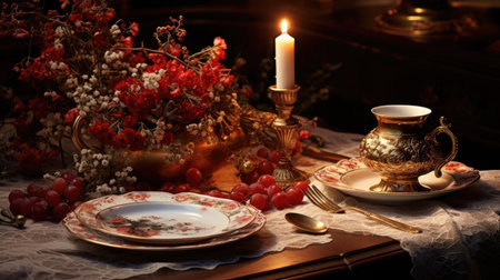 dishes and table details, such as cutlery, decorative plates and flowers, highlighting exquisiteness and attention to detail generative ai