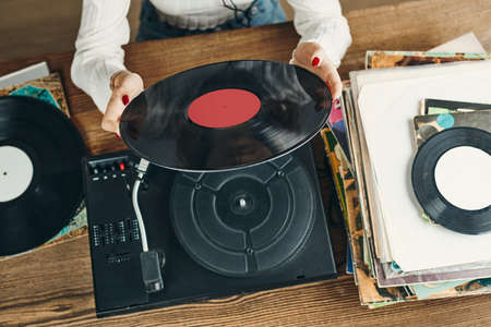 Woman holding vinyl record. Music passion. Listening to music from analog record. Playing music from analog disk on turntable player. Enjoying music from old collection. Retro and vintage. Stereo audio. Analog sound