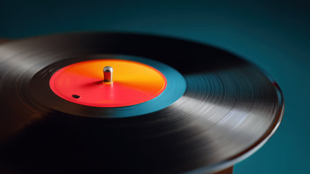A close-up view of a spinning vinyl record captures the intricate details of its surface and a bright red label at the center. The dim light adds a nostalgic ambiance, evoking memories of classic music moments and the warmth of analog sound.