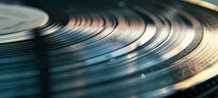 Vintage vinyl record close up with intricate grooves. Reflective surface of classic music medium. Concept of audio detail, record collecting, musical nostalgia, analog technology. Copy space. Banner