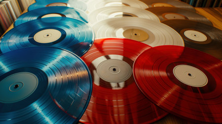 Vibrant vinyl records in various shades on a table
