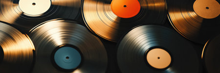 A close up view of several vintage vinyl records illuminated by soft light, creating a nostalgic atmosphere and providing space for text.