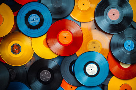 A vibrant collection of vinyl records in various colors, including red, yellow, and blue, is scattered across a surface, showing a mix of classic and modern music styles.