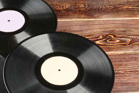 Vinyl records on textured wooden surface. Close up vinyl discs on wooden background. Vintage music albums.
