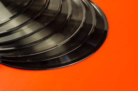 Old black vinyl records with blank orange labels on red background as frame