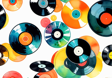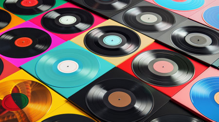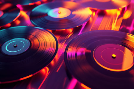 Colorful vinyl records floating in a vibrant background, creating a retro music atmosphere.