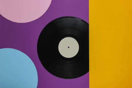 Vintage black vinyl long play record with colorful pellets. Creative disco party concept. Minimal background with neon blue and purple colored lights. Retro futurism.