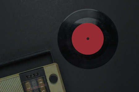 Retro media. Radio receiver, vinyl record on a black background. Top view.