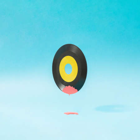 Minimal pop art composition made of vinyl record with yellow label and pink liquid against pastel blue background. Creative retro music concept.