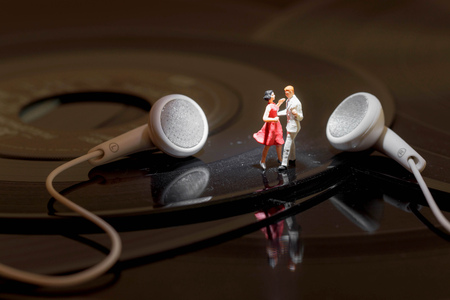 Miniature people : Close up engineer checks the sound quality of the headphone