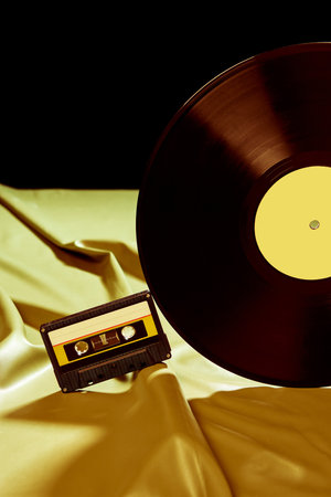 Classic vinyl record close-up on a yellow background, obsolete data storage, music