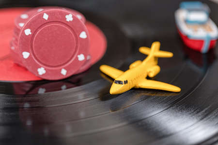 Vintage black vinyl long play record with colorful pellets. Creative disco party concept. Minimal background with neon blue and purple colored lights. Retro futurism.