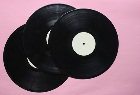 retro dusty vinyl disc with favorite songs and pink hearts on a pink background