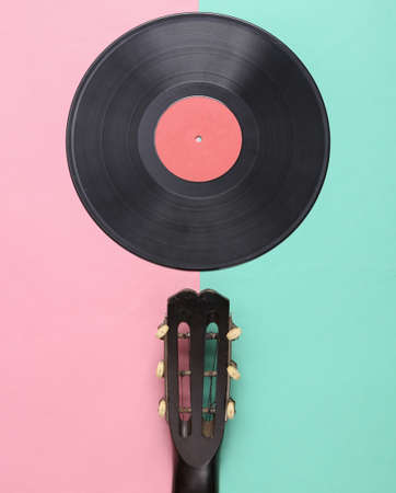 Acoustic guitar neck, vinyl record on pink blue background. musical concept. minimalism. top view. flat lay