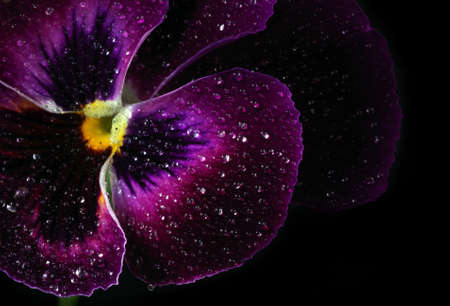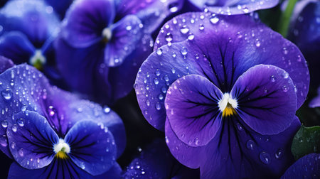 Water droplets resting on the velvety surface of a purple pansy, enhancing its beauty with shimmering reflections
