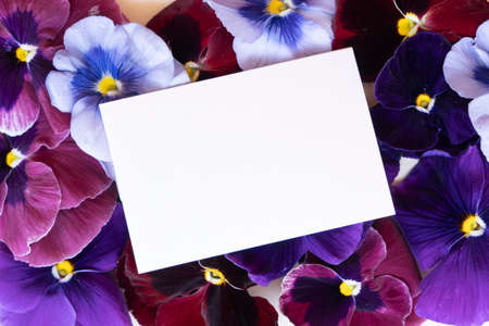 Mother's Day. A greeting card with purple spring flowers. Top view of small violets and leaves. Beautiful spring design, flower frame, creative composition. Women's Day, March 8. Flat lay, copy space