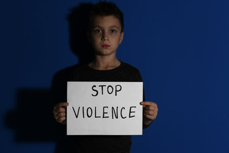 Abused little boy with sign STOP VIOLENCE near blue wall