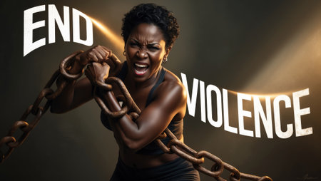 A dark-skinned woman breaks her chains. End violence. November 25.
