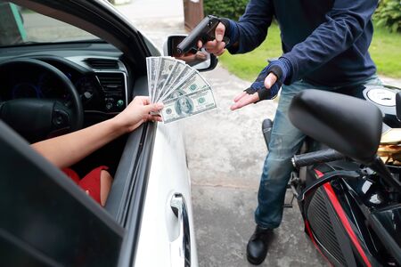 thief with gun on motorcycle stealing money from woman in the car (theft concept)