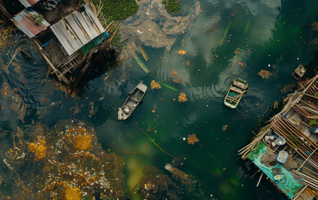 An aerial view reveals an industrial complex beside a river plagued by pollution, featuring waste materials and discolored water, highlighting environmental issues.