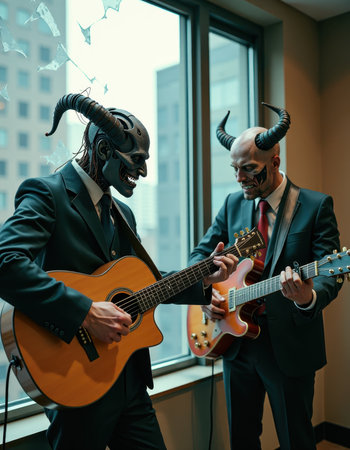 Devilish Duo Businessmen with Horns Playing Guitars, generative Ai
