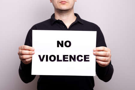 No violence. a man holds a poster in his hands with appeals, a message not to use aggression. no war. a man in black clothes on a white background, close-up without a face