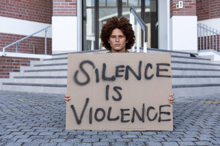 Man with silence is violence sign standing outdoors, black lives matter concept.