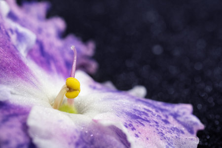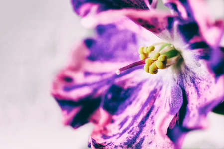 Close-up of a stamen and pistil of a purple violet. Soft abstract image of a beautiful variegated purple flower. Can be used as a postcard, cover