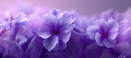 Close-up of soft purple flowers with delicate petals, arranged artistically with light effects