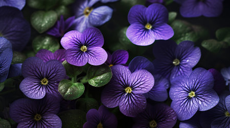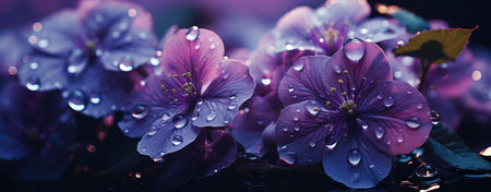 Vibrant purple flowers adorned with droplets of water create stunning visual display, showcasing nature beauty and elegance. rich colors and textures evoke sense of tranquility and freshness