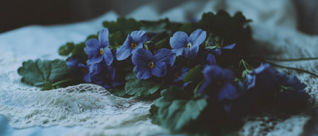 Delicate flat lay of purple violets on vintage lace for a charming aesthetic