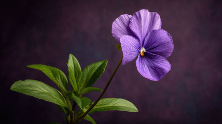 A close-up captures a bright purple pansy flower, its petals detailed with water droplets. Green leaves and a stem support the flower, set against a blurred dark backdrop. The image utilizes natural lighting, emphasizing textures and colors, suitable for botanical illustrations or decorative purposes.